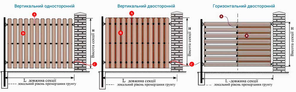Зазвичай штахети кріпляться саморізами по металу або заклепками за допомогою пістолета. Отвори робляться в процесу монтажу. Існують різні варіанти монтажу секцій: